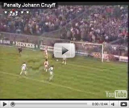 Além de ser um gênio o Cruyff inventava coisas malucas como esta cobrança de pênalti. Nos anos 1974 os holandeses eram os caras…